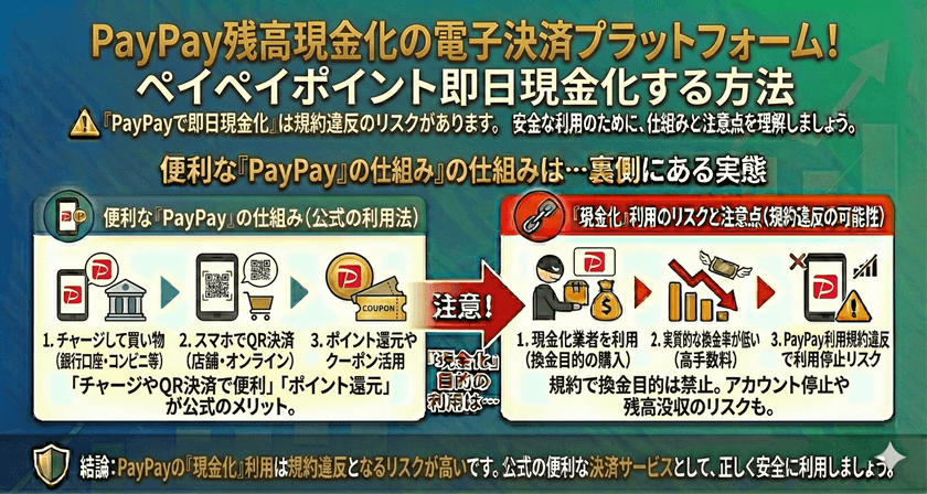 PayPay残高の現金化は、PayPayマネー以外の残高においては原則として不可能であり、非公式な方法による現金化は利用規約違反にあたり、アカウント停止という重いペナルティを課されるリスクを伴います。